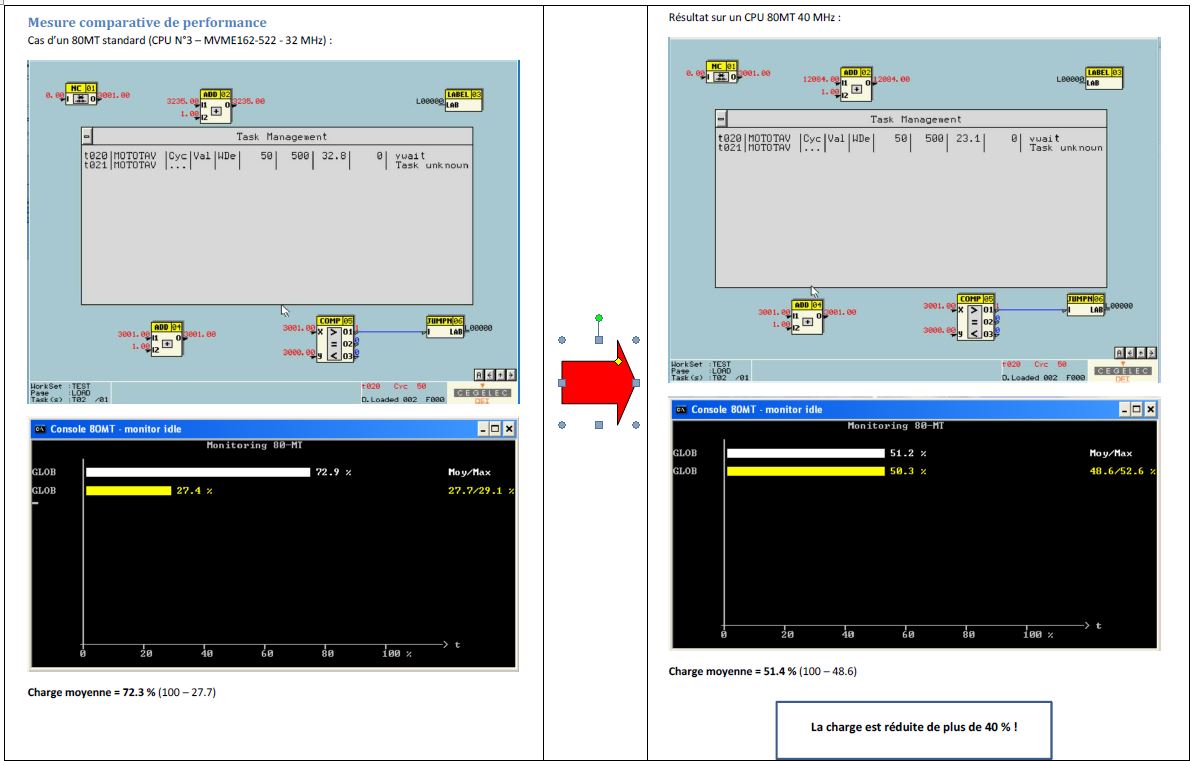 A partir d'une carte CPU du commerce légèrement over-clockée (40 MHz au lieu de 32 MHz) il est possible d'obtenir une UC qui est 40 % plus rapide que la version de base (mesure comparative avec une MVME162-522A). Cela va donc vous permettre de régler la plupart de vos problèmes de surcharge qui sont malheureusement des problèmes endémiques du 80MT !
